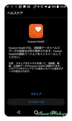「インストール」をタップすると Google Playストアの「Hauwei Health」のインストール画面が開きます。