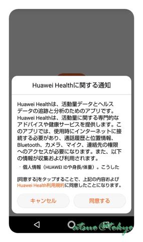 インストールを行い「Hauwei Health」起動すると利用規約の同意画面が表示されます。