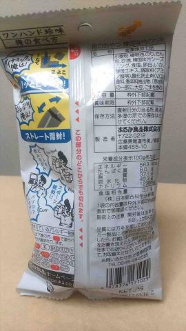 ジャンクフードの範疇に入るスナック菓子です 一袋にはこの数倍くらい↓入っていますビールのおつまみに良く、ちょっとしょっぱいです 海苔の片面に衣を付けて胡麻油で揚げたものでパリパリとした食感で 時々買い置きしてあるのでついつい食べてしまいます 塩分は一袋1グラム弱位ですがもっと有る様な感じがします。