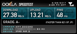 日中は1~2Mbps程度しか出ない厳しい状況ですが、基本的使用するiPad Air2では主にゲームアプリやブラウジングなので、十分な速度でしょう。