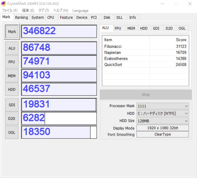 メモリのベンチマークは、Crystal Mark2004R3で比較を行っているので、以前レビューした同じDDR4-2400を32GB搭載したインテルNUCと比較をすると、若干遅い感じです。16GBと32GBの差でしょうか?