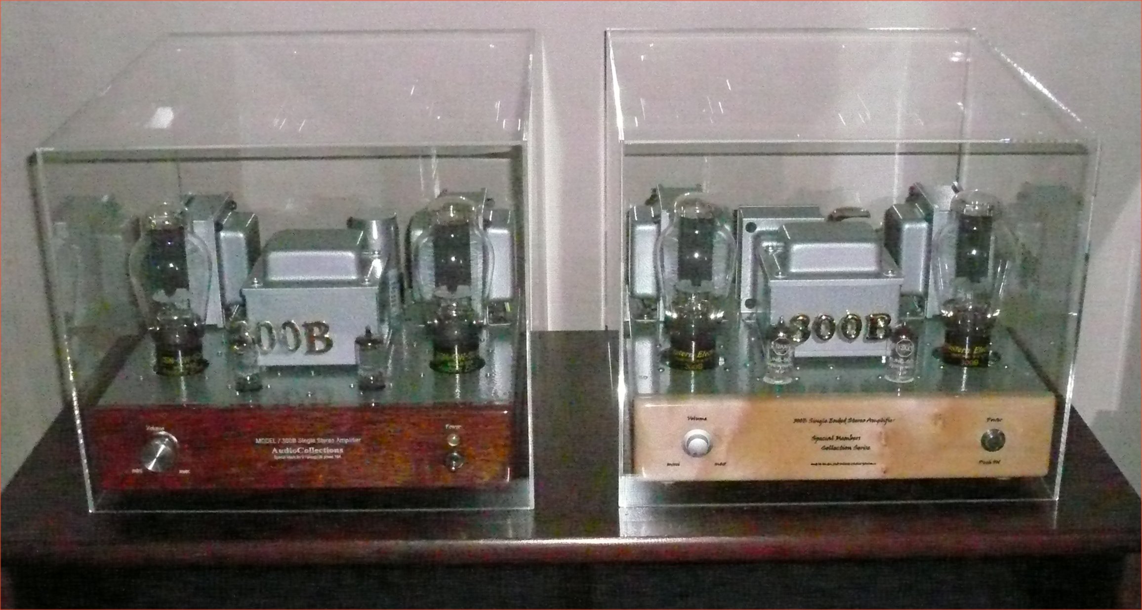 オーダーメイドで知る人ぞ知る某社のHPで「ホワイトシカモアパネルシャーシのシンメトリデザインの300Bシングルステレオアンプ・・ホワイトシカモアは名器ストラディバリの材としてとても有名・・12AX7 SRPPドライブ・・オールノグチトランス使用・・ダブルチョーク回路・・MILテフロン銀メッキ配線材、MIL規格USA抵抗・・カップリングコンデンサーはノッテンの大型フィルム、自己バイアスのバスコンはWEのナンバー、アース母線は極太の銀線・・」と説明のアンプを気に入り、特注(但しホワイトシカモアはもう無いとのことでパネルは花梨材)。シンメトリックで合理的なパーツ配置、300Bを美しくレイアウト、透明感あり力強い音・・。現在、当方の主力アンプとなっています。