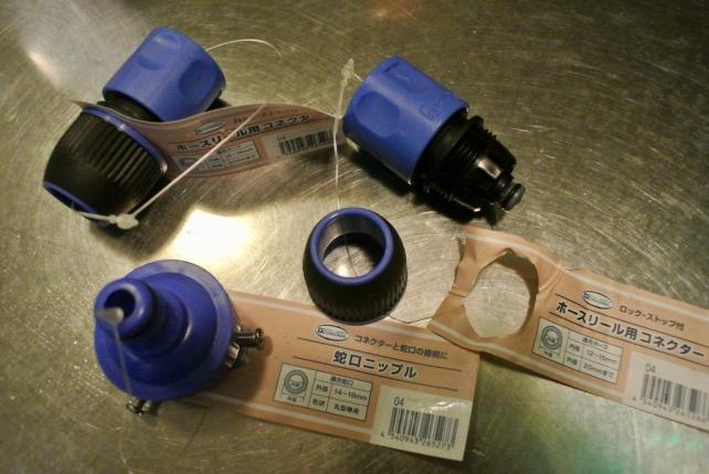 ホース両端に取り付けるアダプターは ひとつ100円弱です。