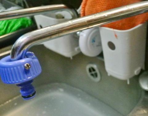 私は、店内で利用する時に、屋外水栓から引き回すことを嫌って、店内厨房内の水栓にニップルを取り付けることにしました。