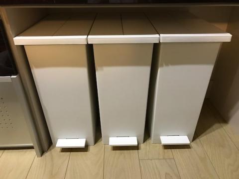 同じような形のゴミ箱は多いとは思いますが、赤や黒のフタであったり、ツヤツヤ主張していたりと、キッチンに2〜3個並べるには少し圧迫感があるものが多いですが、非常にシンプルです。