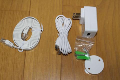 壁掛けフック、充電器、充電用のケーブル、LANケーブルが付属しています。