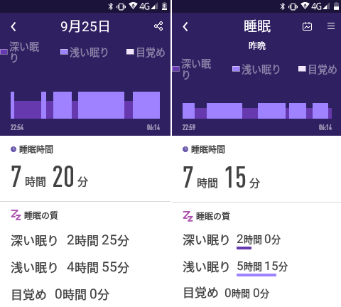 ここ2日間の眠りの状態ですが、睡眠時間は7時間以上あり十分です。