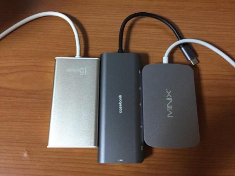 中央が本製品ですがサイズはUSB、有線LAN、HDMIを備えたマルチアダプタなかでは大き目です。