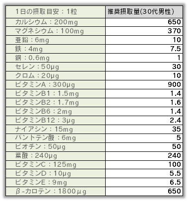 入っている栄養素と30代男性における推奨摂取量を纏めた表を作ってみました。