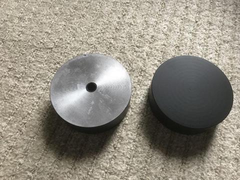 下の写真の、表面が銀色の側の穴が、ターンテーブルのスピンドルが収まるように設計されています。もっとも、実はこの製品はあくまでインシュレーターやベースというべき製品であり、一応レコードスタビライザーとして使えるように工夫されているだけというものです。そのためスピンドルの直系にピッタリと合っているわけでは無く、厳密に言えばセンターが綺麗に出しにくくなっています。