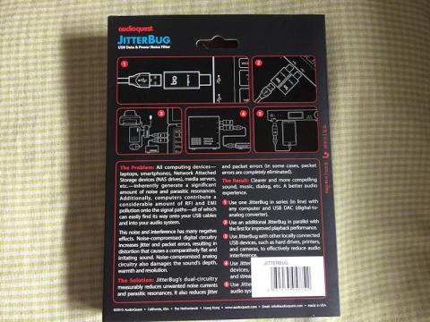 これは恐らくPC側のUSB信号ラインの設計にも、USB DACのノイズ対策にも影響を受けるからではないかと予想されます。JITTERBUG自体が別にデジタル信号を再生成するようなシステムではありませんので、元々PCのUSBの品質が高かったり、USB DAC側のノイズ対策がしっかりしている環境では効果は限定的で、その辺りに難がある環境では劇的な効果が現れると考えればしっくりと来るのです。USB DACの代わりに、PC用のオーディオインターフェースなどで、ノイズを比較的良く拾っていたものと併用すればもっと劇的に改善されたのかも知れません。