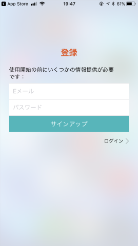 まずはアプリを起動して、ログインするためにメールアドレスとパスワードを