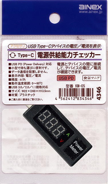 電圧と電流値が交互に表示されるだけのシンプルなもので、USB PD(Power Delivery)にも対応可能で、電圧は、3.5V~24V,電流は0.05A~6Aまで計測可能です。