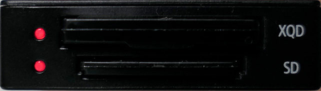 前面には、当然のことながら、XQDカードスロットとSDカードスロットがあります。
