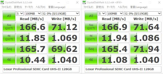 先日購入したUHS-II対応SDXCカードを挿して、Crystal DiskMarkを走らせてみました。