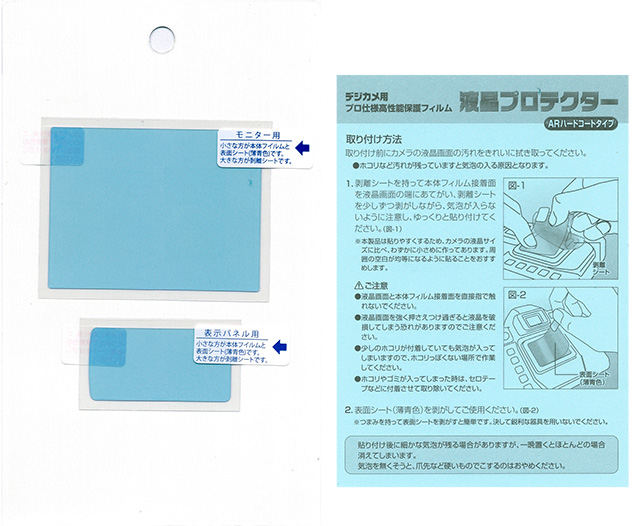 液晶画面と、操作ダイヤル周りの表示をする小型液晶両方の保護シートが入っています。