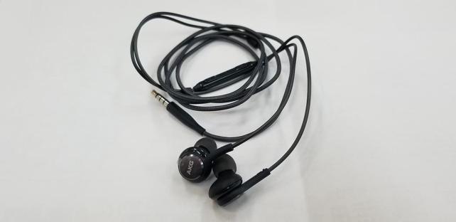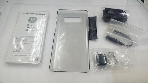 付属品は、試供品の透明ケースと古いスマホと物理的に繋いでデーターを移行するための変換ケーブルにAKGチューニングのイヤホンとイヤホンの延長ケーブルに見えるTVアンテナになります。