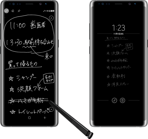 待機状態でも、スタイラスペンを引き抜くと画面にメモができる機能です。