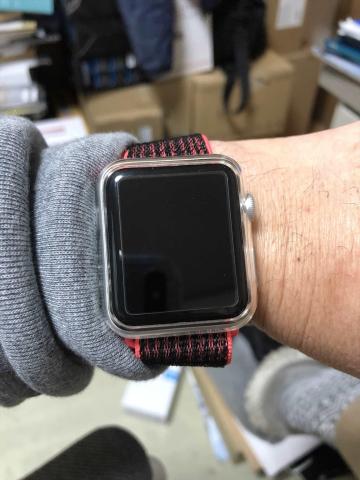 これは実際は浮いているわけではありません。Apple Watchのディスプレイではないところは、透明ではなく真っ黒です。その真っ黒のところに、フィルムが掛かって、あたかもフィルムが浮いているように見える。ですから、