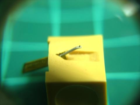 丸針の前後はないのですが、楕円針他の針は前後があります それを顕微鏡で見ながら判別してカンチレバーに組み立てます レンズで拡大しても判別困難なのに接着までするって凄い技です。