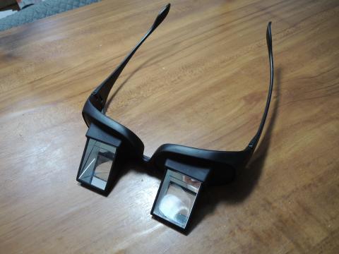 このメガネはプリズムにより実際目線が90度下が見えます。ですので寝た状態(天井を見る感じ)でテレビを見る事ができます!