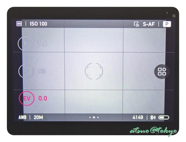 「Program mode」(プログラムオートモード、以下 Pモード)の時は以下の様になり、右側に設定ボタンが表示され、左側の[F][S][EV]の内、変更出来るものだけ色が変わっています。