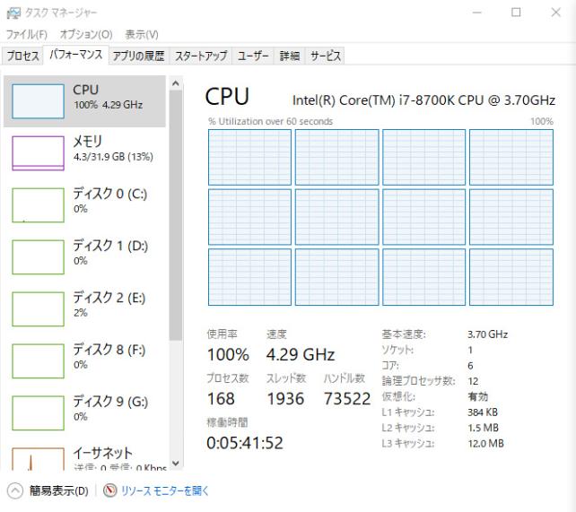クロックに関しても、何もオーバークロックの設定をしなくても、簡単に4.7GHzまで(使用コア数が少ない場合)クロックアップしますし、重たい処理をさせても、全コア100%の利用率@4.3GHzで楽々処理をしてくれます。
