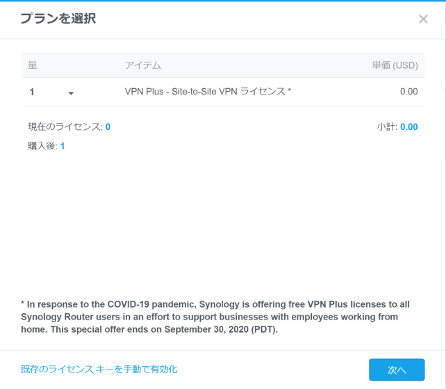そして「Site-to-Site VPN」ライセンス1つを無料で有効化。