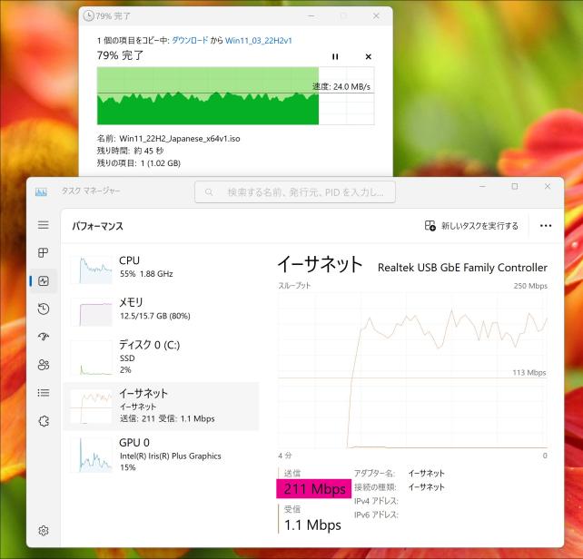 家と職場でWindows11のISOイメージをコピーしてみましたが200Mbps程度出ています。