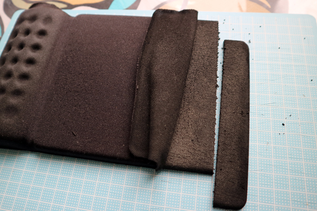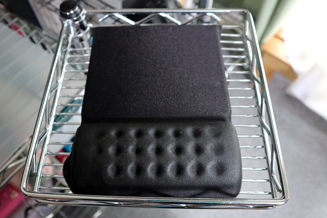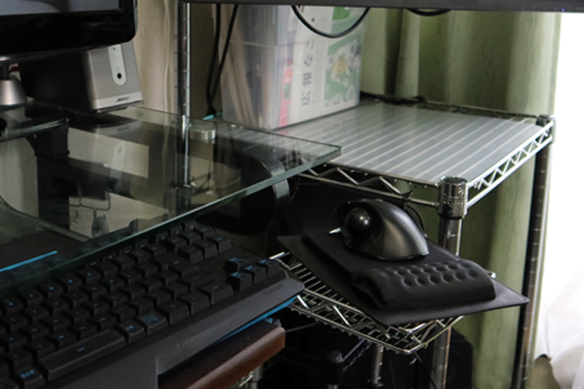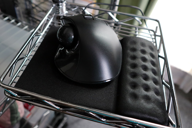 トレイ内にトラックボールを収めると操作しにくいので、固めのマウスパッド(100均モノ)を引いてその上にリストレストマウスパッドを2枚敷きにしました。