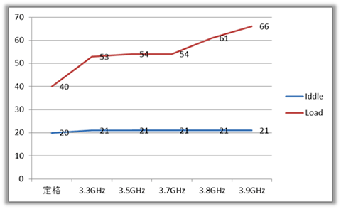 定格から3.9GHzまで冷却性能を計測しましたが、謳い文句通り、急激な温度上昇などは見られませんでした。3.7GHz(Core電圧Auto設定)までのOCであれば、CPUクーラーの性能で緩やかな温度分布になっていることが分かります。今回の環境においては3.9GHzが66℃まで上昇しているので、オーバークロックとしてはこの辺りが限界かな?と思います。