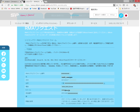 シリコンパワーのホームページ上で製品登録して、RMA対応の依頼を出しました。
