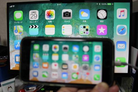 iOS11.1.2のiPhone 7 Plusを使いました。解像度が同じなので、iPhoneの映像をそのまま拡大したようになります。音声もキレイに出力されています。
