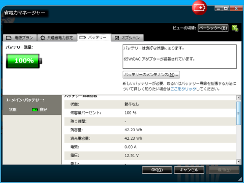 これが初回充電直後の状況ですが、満充電容量が42.23WHとなっていますので、表記上の性能よりも1/4程少ないというお粗末さです。それでも、元のバッテリーのように5分も使えないということはありませんので、価格を加味すれば十分すぎるだけの中身といえますが。
