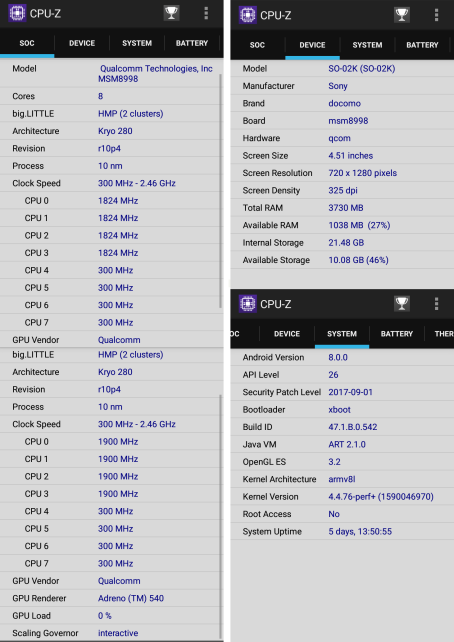 CPU Snapdragon 835 MSM8998(2.45GHz×4+1.9GHz×4、オクタコア)