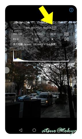 撮影した画像をギャラリーで確認すると、画像情報を表示出来どのモードで撮影したか分かったり(一部)ヒストグラムなども表示されて便利です。