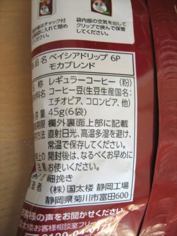 スーパーベイシアで販売しているドリップコーヒーで6パック入りです ベイシアに買い物に行ったときに見つけました 山積みに為っていたのと、モカで一袋100円でしたので一袋だけ買ってきました 要冷蔵でないのもお手軽ですしレギュラーも有りました。