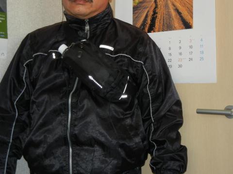 実際に装着してみました。・・・ウォーキングに出かける前だったのでバックも黒でいまいちですが・・・おなか周りが結構太い私でも、問題なく使用できます。