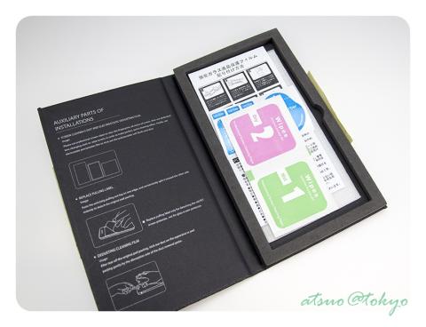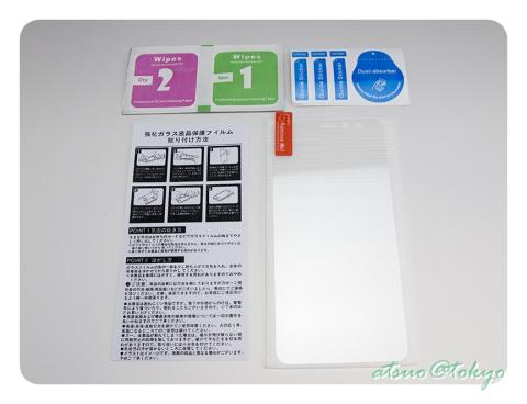 ガラスフィルムの他、ドライタイプとウェットタイプのクリーニングペーパー、ホコリ取り用シール等が入っています。