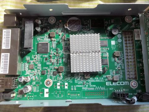 基板はELECOMのロゴが印刷されていて、このシリーズ専用に起こされたもののようです。意外と凝ったことをしているものだと驚きました。CPU(SoC)はヒートシンクの下に入っていますが、グリスを落とさないとCPU表面の文字は読めそうに無く、手持ちのグリスもあまり量が無かったので確認は断念しました。