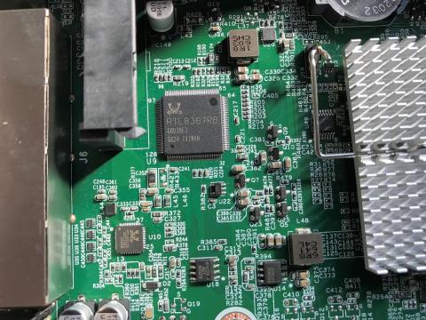 ネットワークコントローラー部を拡大してみました。コントローラーはRealtek製RTL8211Eで、これで1000BASE-Tまでをサポートします。大きい方のチップRealtek RTL8367RBはNICの物理層となります。