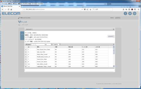 WD40EZRZのS.M.A.R.T情報も取得できています。丁度Windows上でCrystal Disk Info等で表示する内容と同じですね。