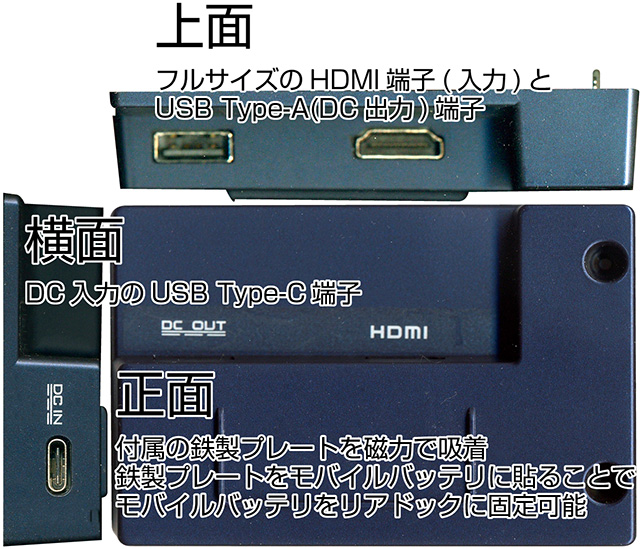 リアドック正面上方からHDMI機器/ケーブルとUSB Type-AのDC出力ケーブルが挿せます。