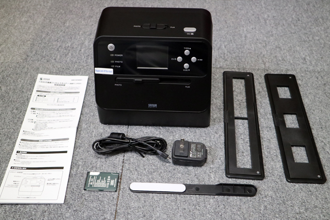 左から 取説、フィルムスキャナー本体、USBケーブル、ACアダプター、バッテリー、クリーナーブラシ、35mmフィルムフォルダー。