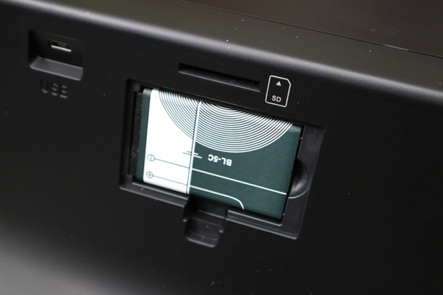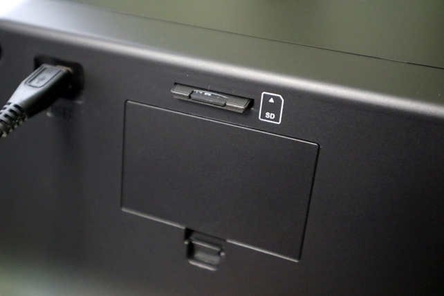 本体の裏側にUSBコネクター、SDメモリーカードスロット、バッテリーポートがあります。