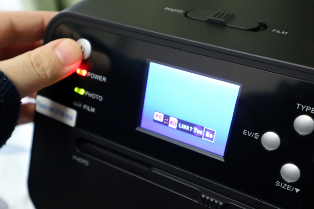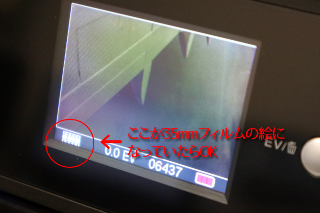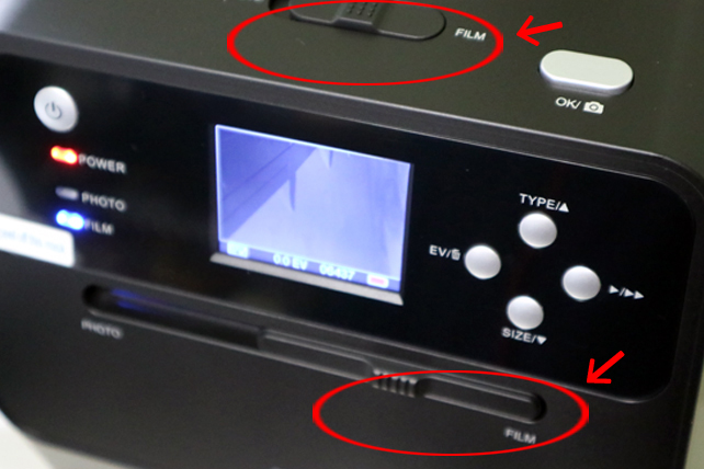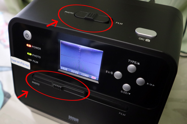 フィルムスキャンをする場合は、上の切り替えスイッチと、ディスプレイ下の切り替えスイッチをどちらも[FILM]にセットして