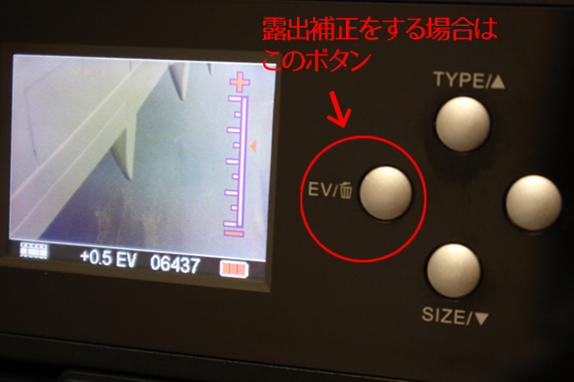 露出補正をしたければ、[EV/ゴミ箱]ボタンをおしてから、[▲][▼]で上下して補正します。