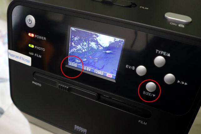 [SIZE/▼]ボタンでサイズを選択してから、 上の[OK/撮影]ボタンを押してスキャンします。