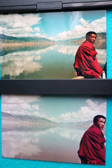 ですが、濃淡が激しすぎてつぶれてしまっている部分も多いです。あと、写真がカールしていたので、よりゆがみが激しくなっています。チベット僧のおじさまが、ちょっと太って見える…。古い写真は、アルバムからはずさずにそのまま取り込んだほうが良さそうです。