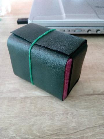 針と糸の裁縫なし、素材はダイソーで購入したフェイクレザーとあまりもののスポンジ。固定は強力両面テープと輪ゴムというなんとも不思議なケースの試作版ができました。フェイクレザーなので切れ端がほつれる心配がないのは楽でよかったです。